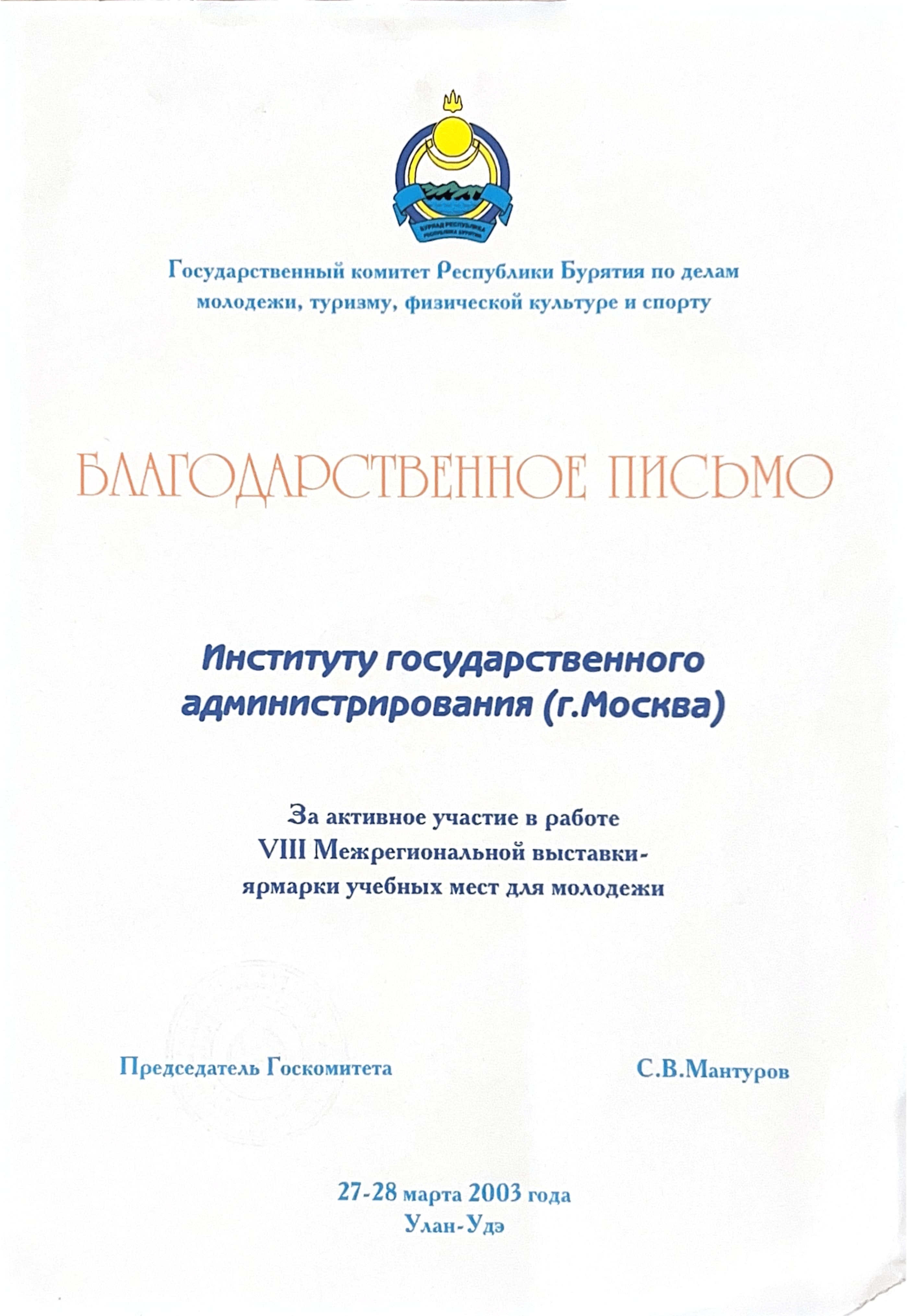 - Благодарственное письмо от Государственного комитета Республики Бурятия по делам молодежи, туризму, физической культуре и спорту. За активное участие в работе VIII Межрегиональной выставки-ярмарки учебных мест для молодежи. 2003 год.
