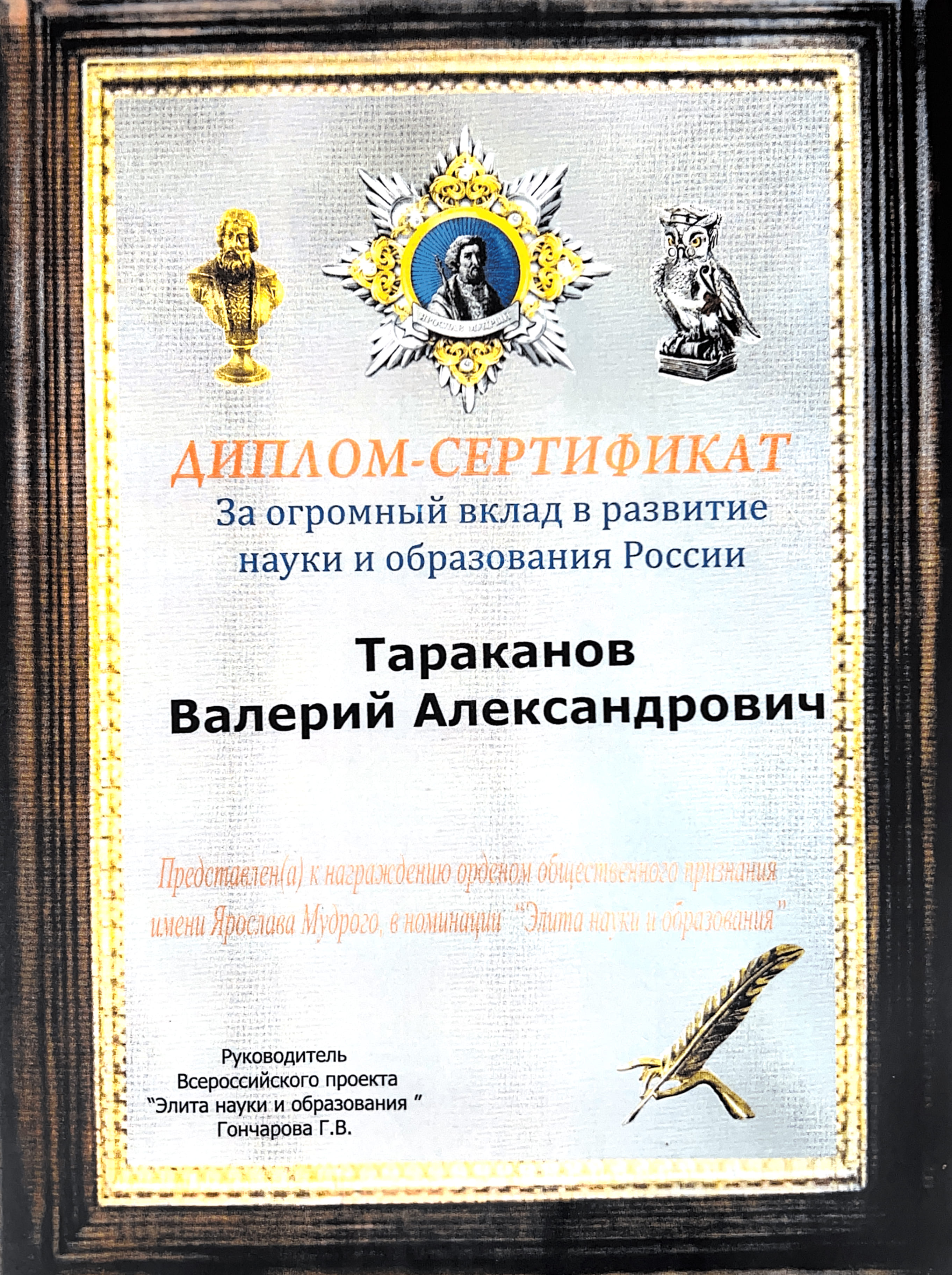 - Диплом-сертификат ректору Тараканову Валерию Александровичу за огромный вклад в развитие науки и образования России. Представлен к награждению орденом общественного признания Ярослава Мудрого, в номинации «Элита науки и образования».