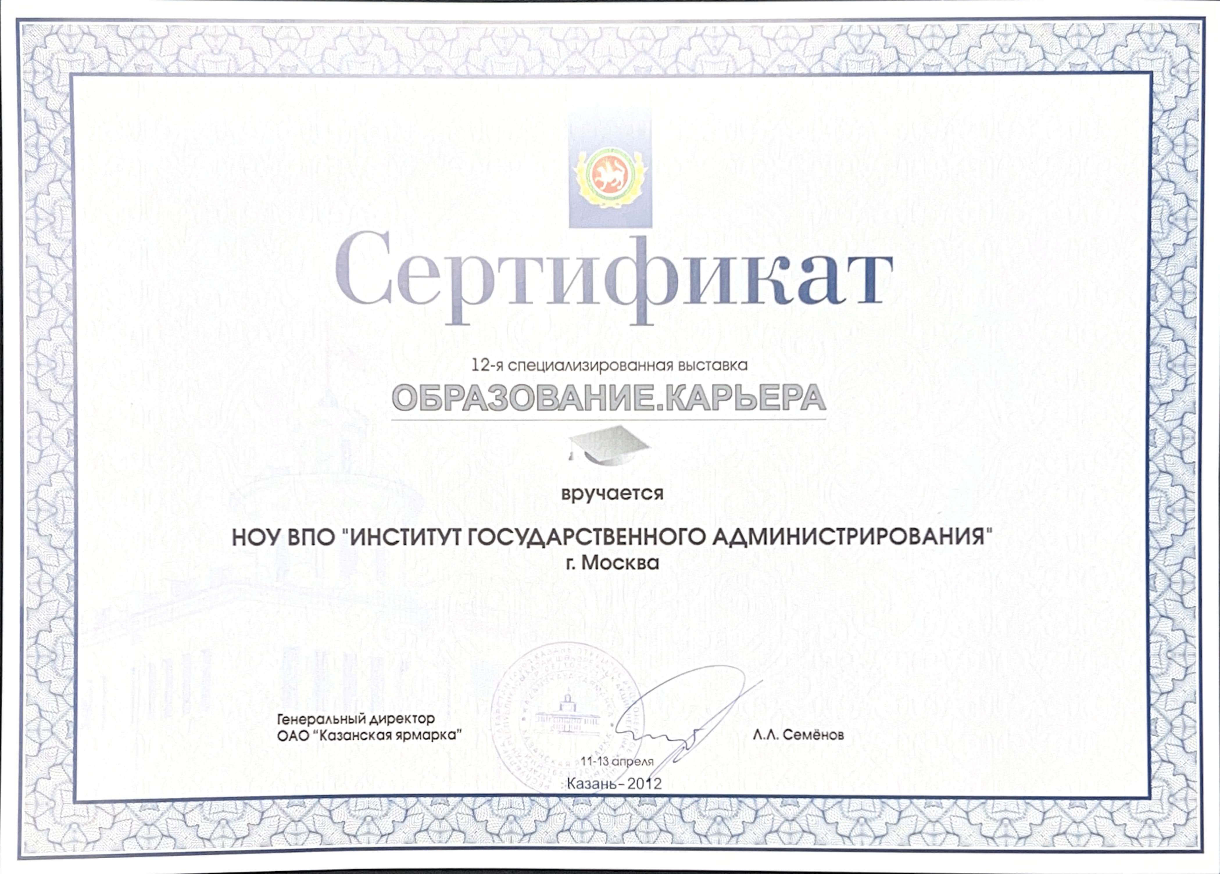 - Сертификат 12-ой специализированной выставки «Образование. Карьера» 2012 год.